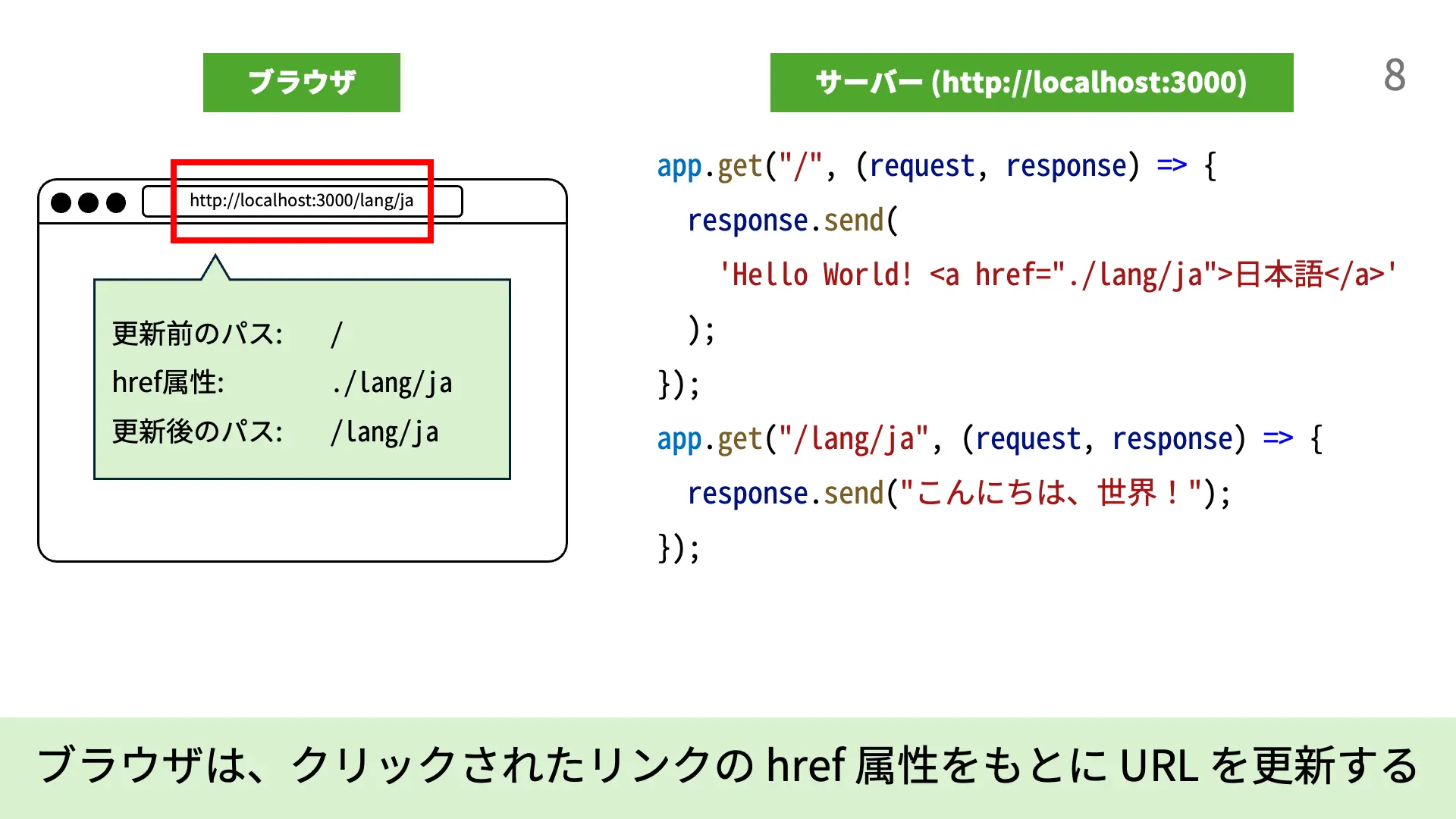 • href属性が相対パスの形式で指定されていれば、現在のパスを基準にLinuxにおける相対パスと同様の方法でURLを更新します。この例では、更新前のパスが/で、href属性には./lang/jaが指定されているため、更新後のパスは/lang/jaになり、URLはhttp://localhost:3000/lang/jaに変化します。